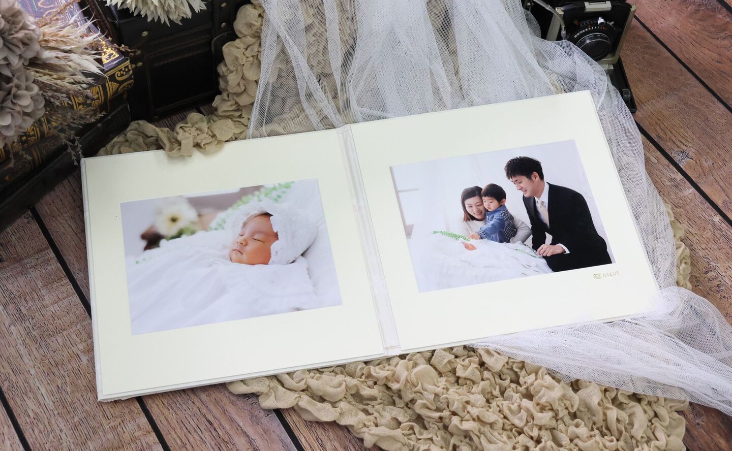 30センチの2面スクエアアルバムに5カットの写真をレイアウト。 マットな面質でまるでアート作品のような仕上がり。 身長体重も入れられて世界で1つだけのアルバムです。