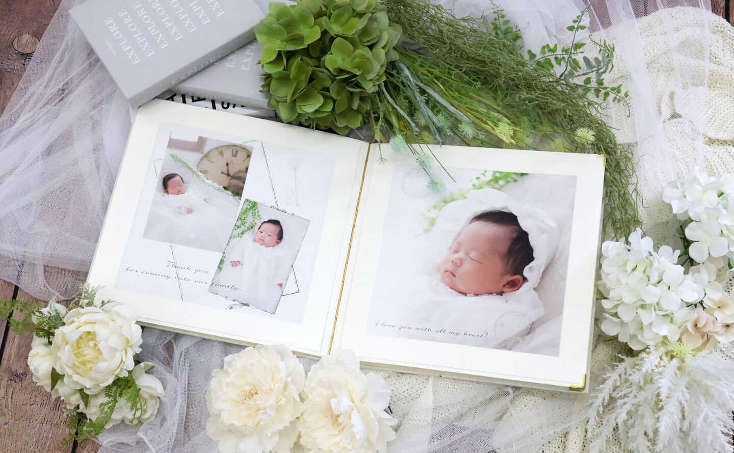 30センチの2面スクエアアルバムに5カットの写真をレイアウト。 マットな面質でまるでアート作品のような仕上がり。 身長体重も入れられて世界で1つだけのアルバムです。