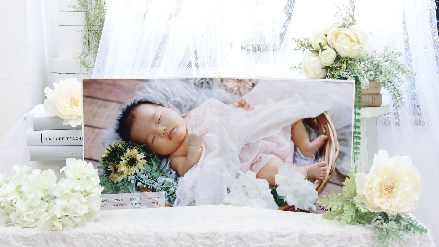 オリジナル命名フレームと一緒に撮影できます。心を込めて命名した時の思いをお写真に残せます。