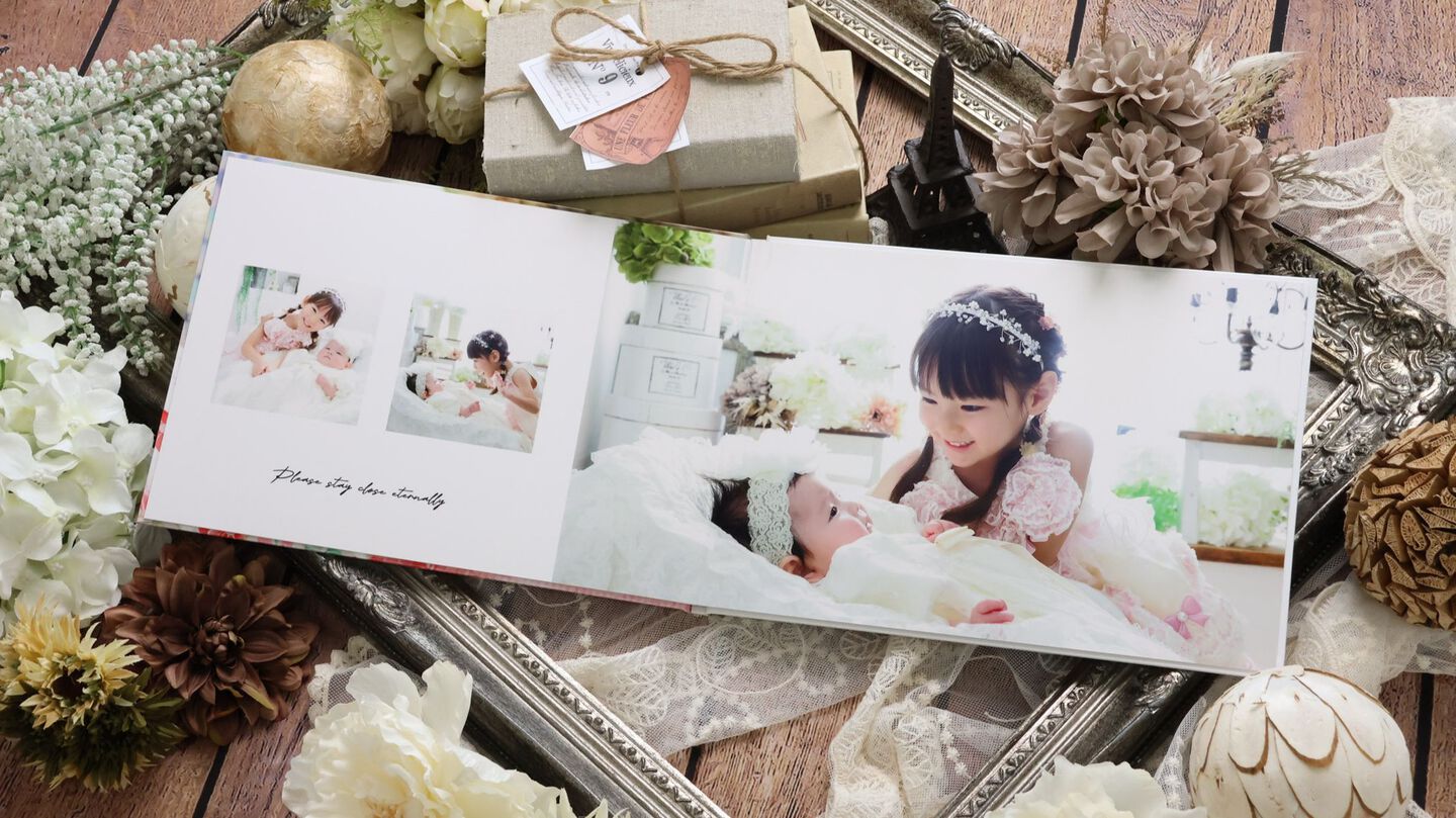 横型A4サイズの4ページアルバムに8カットの写真をレイアウト。 光沢な面質で見栄えの良い仕上がり。 表紙にも写真が入るので、お子様だけのオリジナル写真集。 データも付いてお得です。