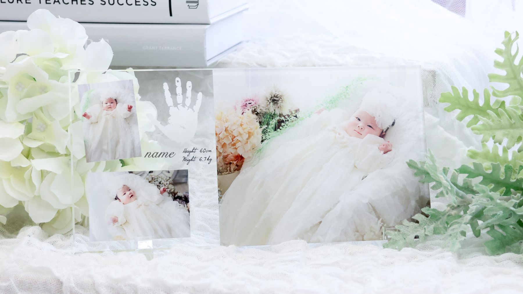 アクリルフレームに手形やお名前、身長体重を入れられます。