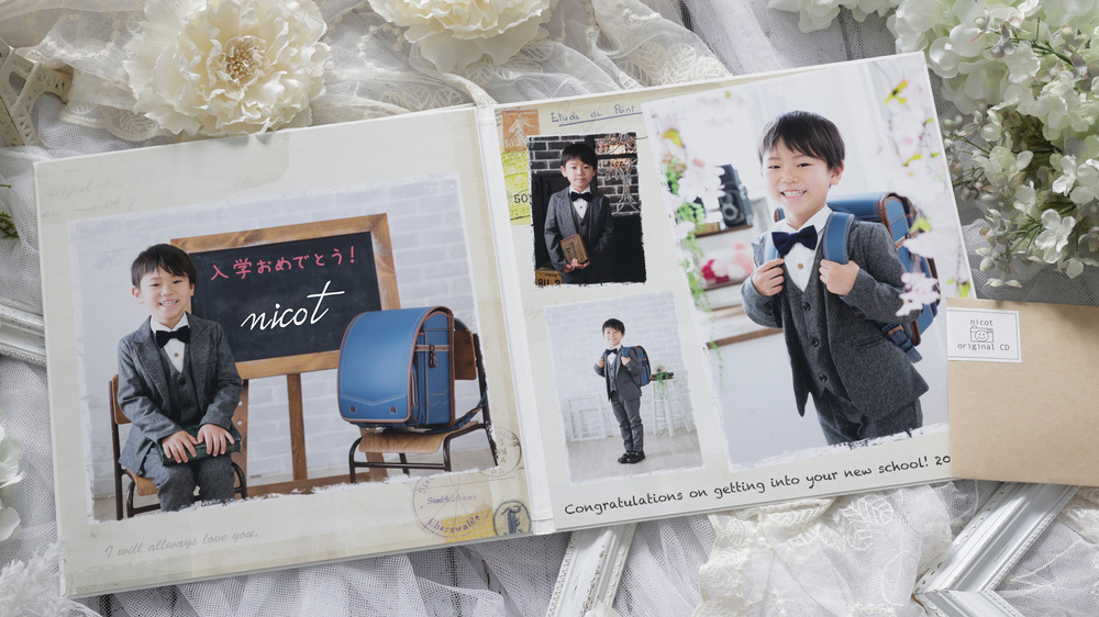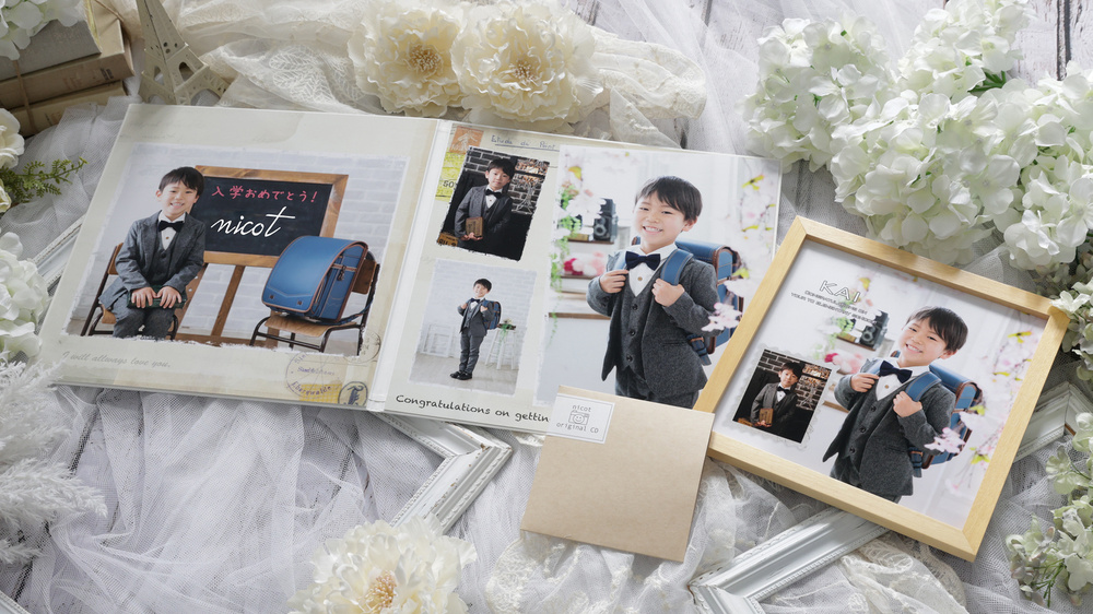 お子様が書いたお名前が入れられる特別なデザイン台紙!データが6カットつきます!